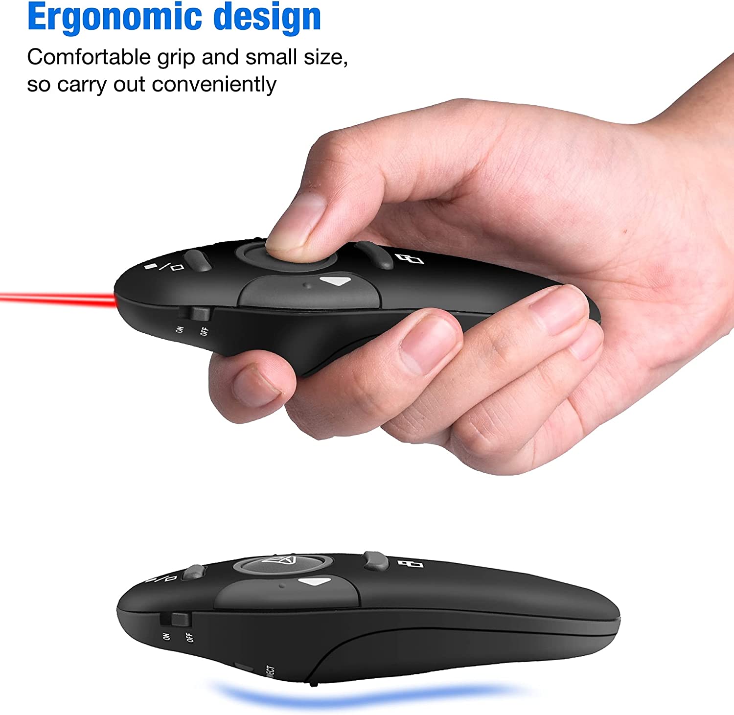 Plástico ABS respetuoso con el medio ambiente: diseño ergonómico científico y aspecto suave; un receptor inalámbrico plug and play; tecnología inalámbrica: 2,4 GHz; paquete: 1 control remoto inalámbrico de presentador, 1 receptor inalámbrico ultrafino, 1 manual de usuario, 1 batería AAA no incluida